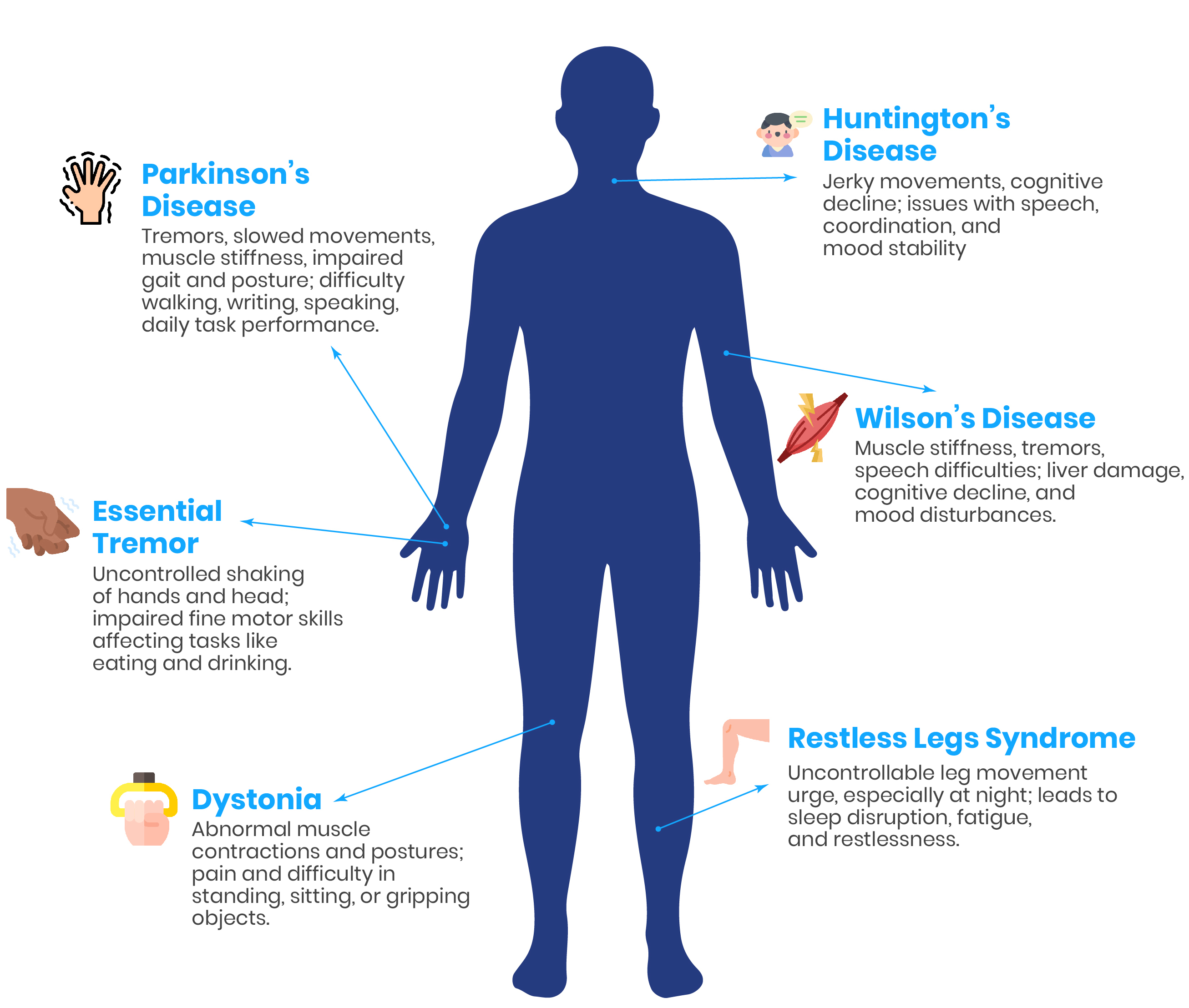 Movement Disorders are characterized by slowing of body movements, muscle stiffness, and tremors. Some people may have cognitive impairments, such as memory and concentration impairments. Emotionally, social disengagement and embarrassment may impact one's life due to these symptoms. Movement and coordination might become more difficult when the sensory feedback system gets affected.