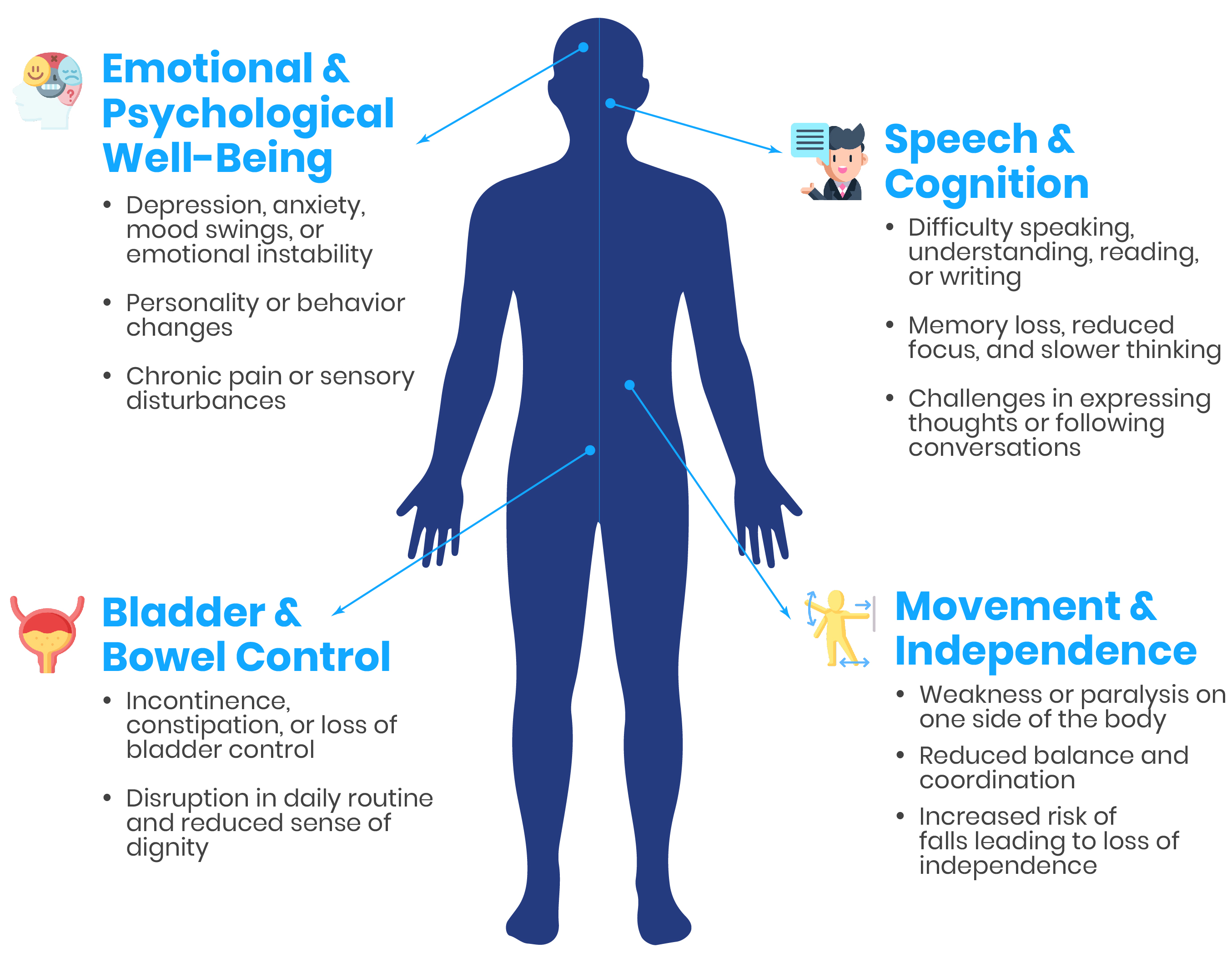 A stroke's impact doesn't end when the medical emergency passes can last a lifetime. It can influence movement, communication, body functions, memory, and emotional health - requiring ongoing care and rehabilitation for recovery and independence.